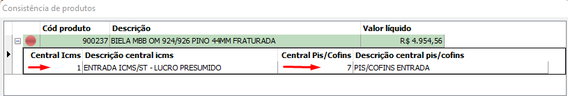 O sistema vai apresentar a tela de consistência de produtos e ficará em destaque os itens com tributação divergente do esperado na central de tributação. Cabe ao responsável fazer a devidas validações e conferência e continuar o processo.