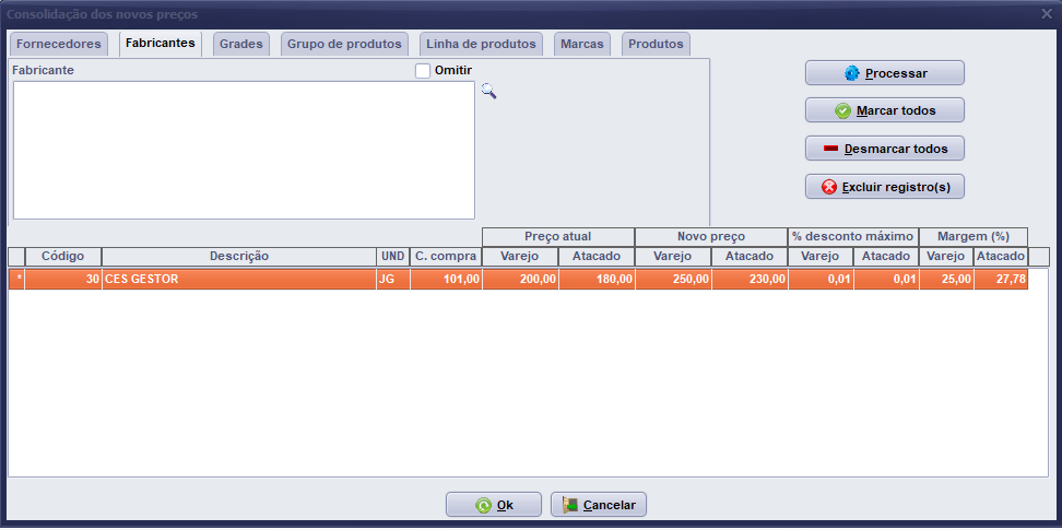 Nesta janela serão apresentados os produtos lançados na janela "Alteração de preços manual". Será apresentado o preço atual do produto (varejo e atacado) o novo preço do produto (varejo e atacado), % de desconto máximo (varejo e atacado) e a margem de lucro. Em cima dessas informações, o usuário poderá analisar se deseja ou não realizar imediatamente a consolidação do novo preço de venda do produto. Caso deseje realizar a consolidação para os novos preços, então deverá selecionar os produtos desejados e pressionar o botão Ok. A partir daí os novos preços ficarão em vigor, ou seja, o sistema alimentará a lista de preços do cliente (CTRL+T).