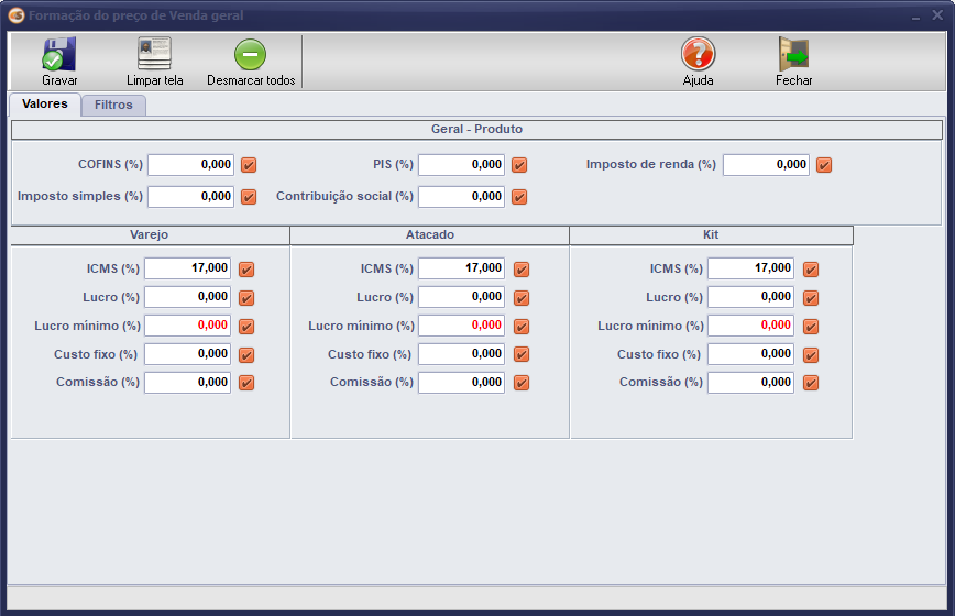 Esta tabela de formação de preço de venda compreende o Custo Fixo (despesa que a empresa tem para manter mensalmente), PIS, COFINS, CPMF, ICMS, Imposto de Renda, Comissão, Contribuição social e o Lucro que deseja obter em cada produto. Nesta tabela, você poderá informar também o lucro mínimo (Varejo, Atacado e Kit) que deseja obter com a venda deste produto, fazendo com que a sua empresa não tenha prejuízo.