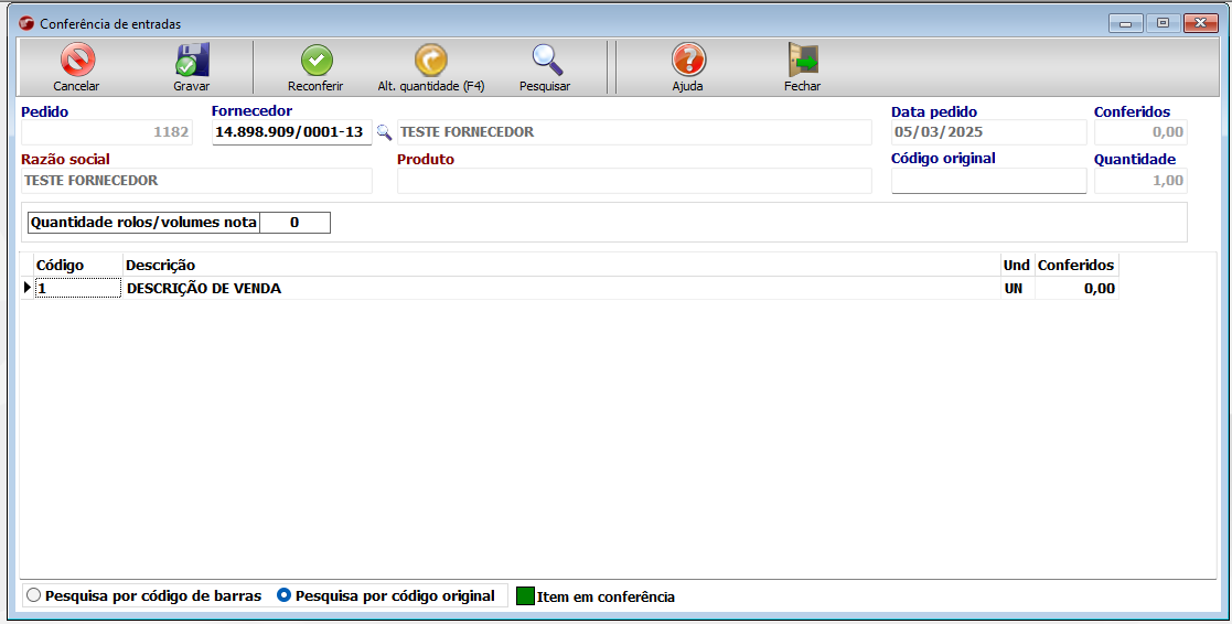 Na tela acima temos a opção de conferir o produto pelo código de barras e pelo código original, estes são informados no cadastro do produto. Após conferir, é só voltar a tela de recebimento, e dar prosseguimento: