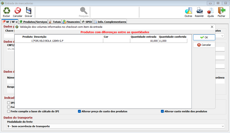 Retornando a tela de entrada, desmarcando a flag 'Pré-Entrada' e clicando em 'Gravar', havendo divergências a tela abaixo é apresentada: