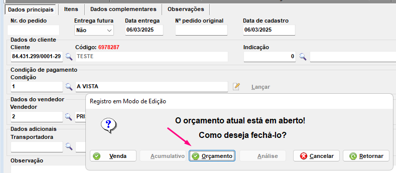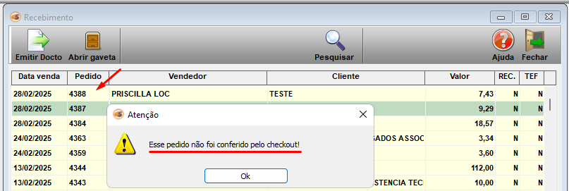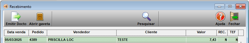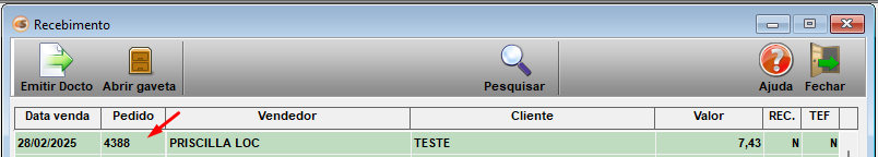 Clicando em 'Gravar', pedido será gerado e encaminhado para a tela de recebimento, para dar prosseguimento: