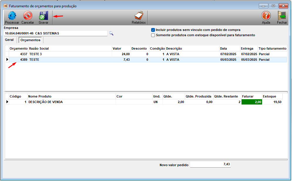 Após gravar e conferir o orçamento para produção, como na imagem acima, o mesmo irá para a tela 'Vendas | Gerenciamento de produção | Faturar pedido para produção | Faturar' no Gestor: