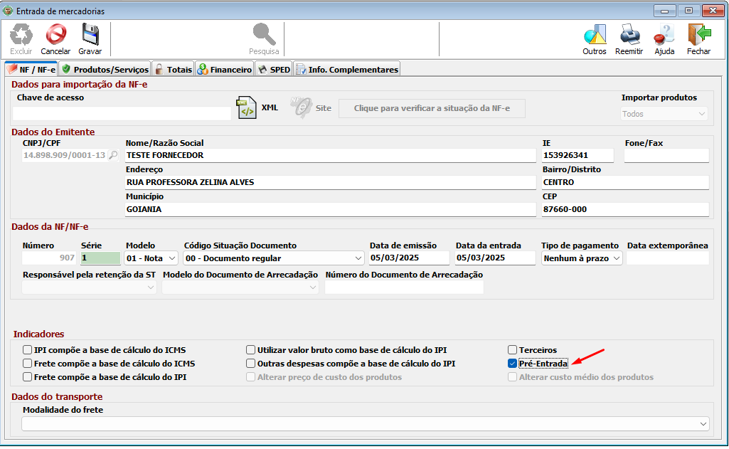 Obs.: Estoque e financeiro não são alimentados ao gravar a entrada com a flag 'Pré-entrada' marcada.