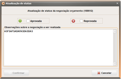 Ao clicar a tela abaixo é aberta, para usuário gestor informar que a negociação foi analisada e se a mesma está APROVADA ou REPROVADA.