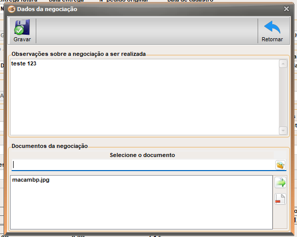 4. Clicando em Negociação, a tela 'Dados da negociação' aparecerá, um espaço para adicionar informações referentes à negociação e um espaço para adicionar imagens ou .PDF's:
