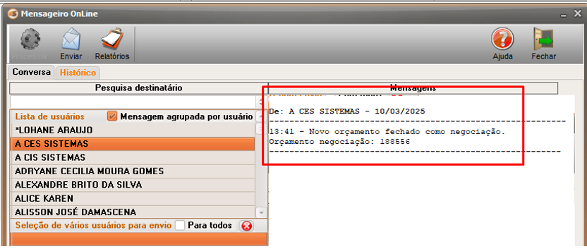 Para o usuário receber notificações via mensageiro OnLine, referente a orçamentos que são encaminhados para negociação, e quando a negociação for 'ANALISADA'.