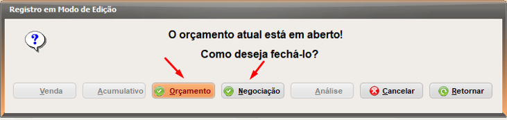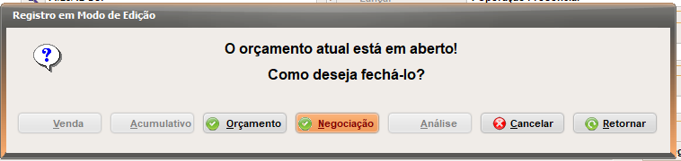 5. Quando orçamento é gravado como 'NEGOCIAÇÃO', ele só pode ser salvo como orçamento 'NORMAL', já orçamento do tipo 'PRODUÇÃO' em primeiro momento, ficará indisponível.