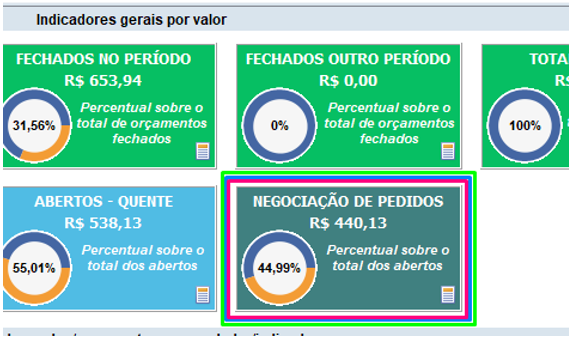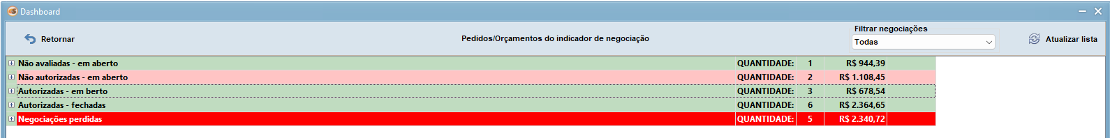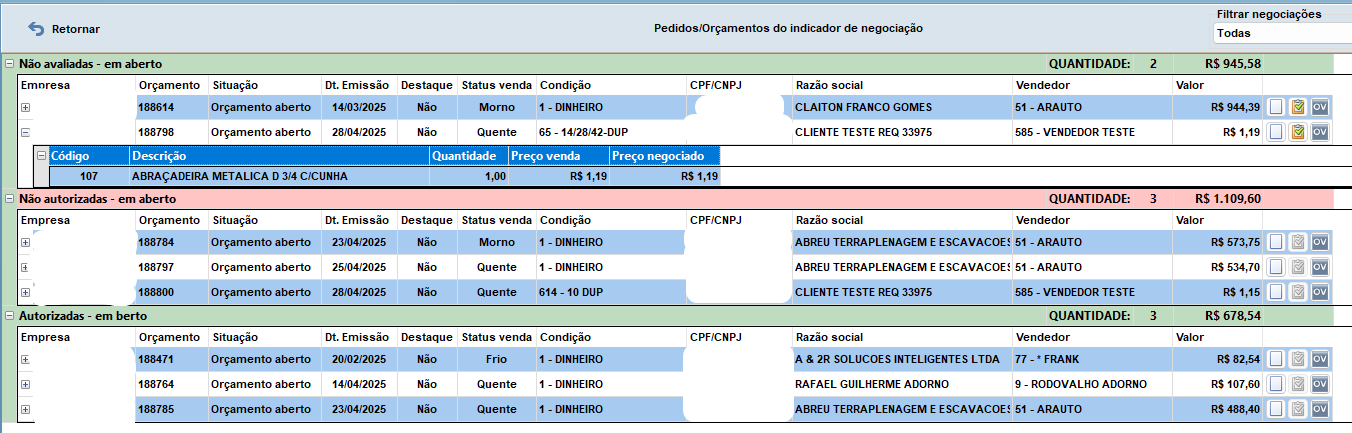 7. Duplo clique em cima do CARD com o nome 'NEGOCIAÇÃO DE PEDIDOS', a tela 'Pedidos/orçamentos do indicador de negociação' é aberta: