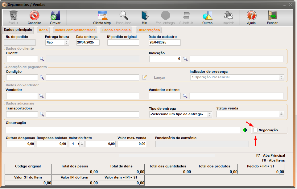 3. Acesse o Gestor e no caminho 'Vendas | Orçamento/Vendas', na tela foi criada uma flag, mostrada na figura abaixo. Ao clicar para gravar o orçamento, a opção 'Negociação' aparecerá: