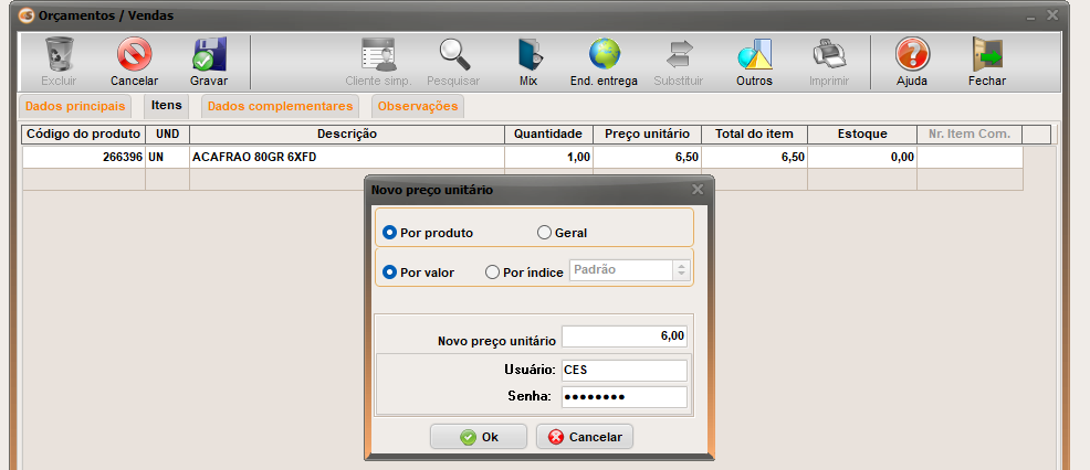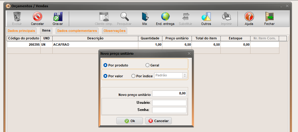 vendedor aumenta o preço de algum produto na venda, esse aumento gera um saldo