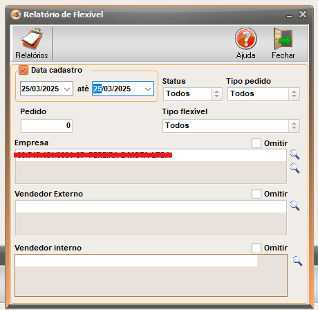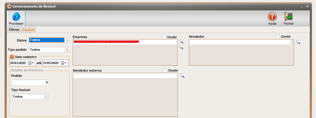 Na tela é possível filtrar pelo Status do flexível, Tipo de pedido, Data de cadastro do pedido, Número do pedido, Tipo de flexível, Empresa, Vendedor e Vendedor externo.