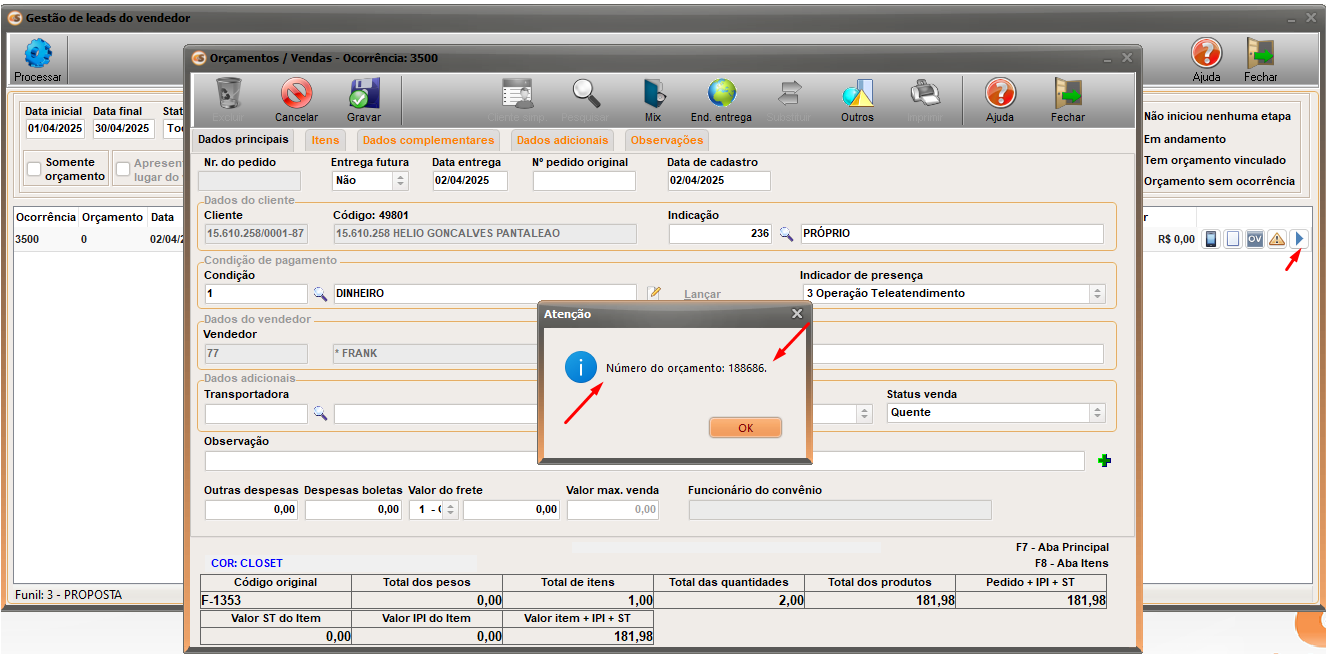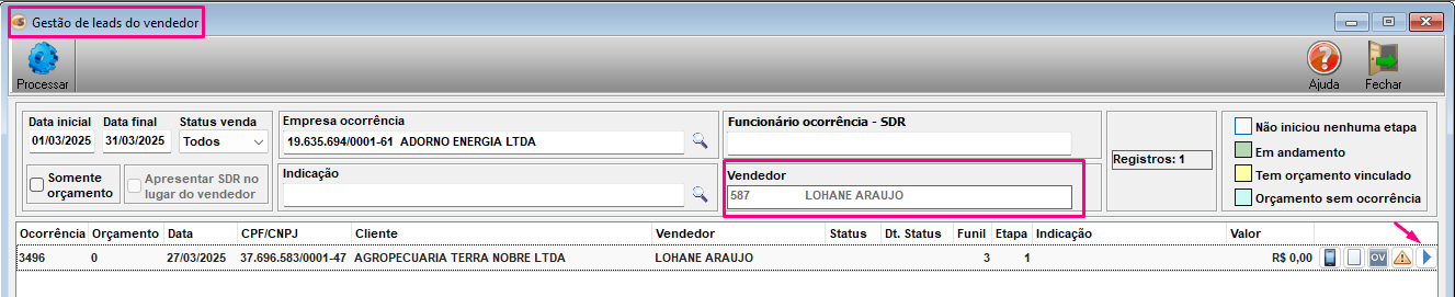 Quando o vendedor finaliza a venda, o sistema identifica a ocorrência associada ao SDR que originou o lead.