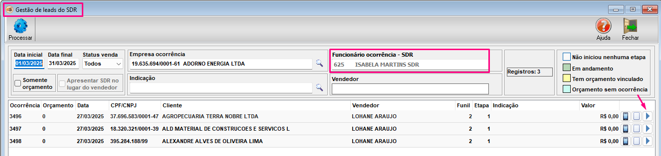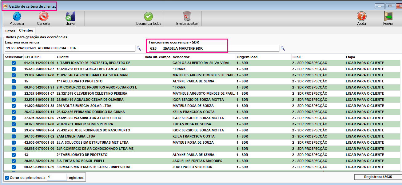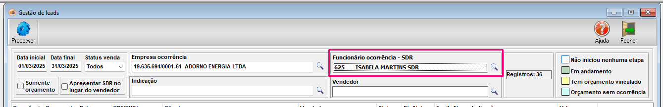 1 - Usuário 'Gestor CRM' gera as ocorrências para o SDR.