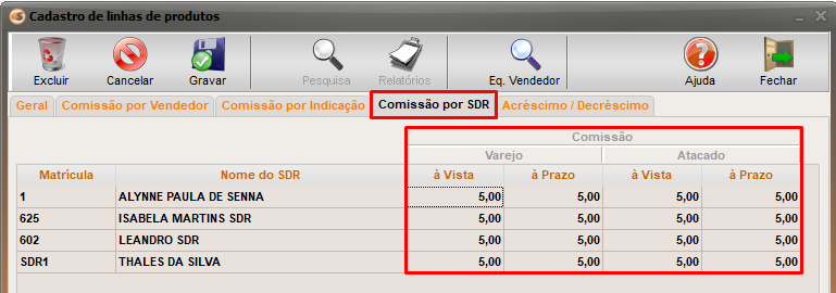 0 - A comissão é informada no cadastro da Linha do produto 'Cadastros | Produtos | Linha de produtos', na guia 'Comissão por SDR':