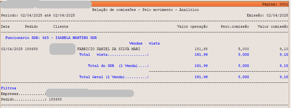5 - Comissão é gerada, podendo ser acessada pelo caminho 'Vendas | Relatórios | Relação de comissões | Por SDR'.