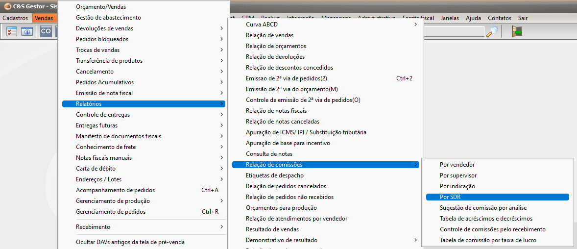A comissão é vinculada à ocorrência do SDR e fica disponível para consulta em Relatórios de Comissionamento do Gestor.