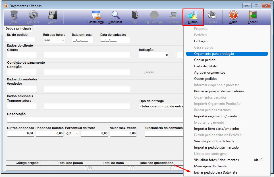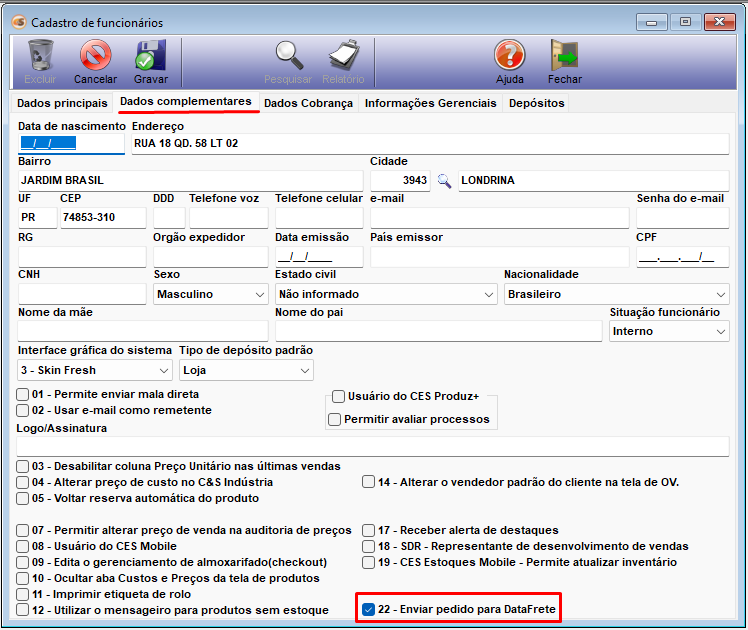 No Gestor, em 'Administrativo | Funcionários | Cadastro' na guia 'Dados complementares', marque a flag '22 - Enviar pedido para DataFrete'. Isso é necessário para que os pedidos gerados sejam enviados ao DataFrete. (Tela02)