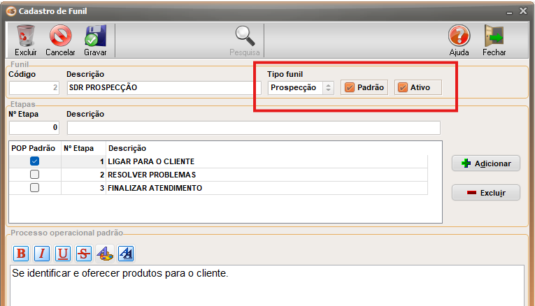 Deve existir um funil padrão de Prospecção e um funil padrão de Venda, com suas respectivas etapas configuradas antes do uso.