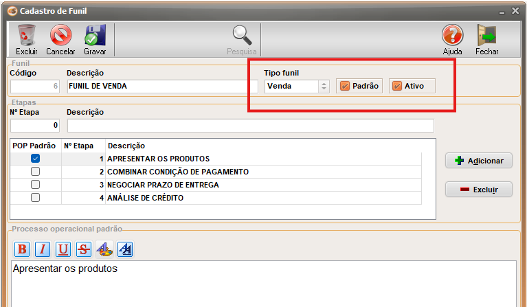 É obrigatório definir e numerar as etapas que compõem o processo operacional de cada funil.