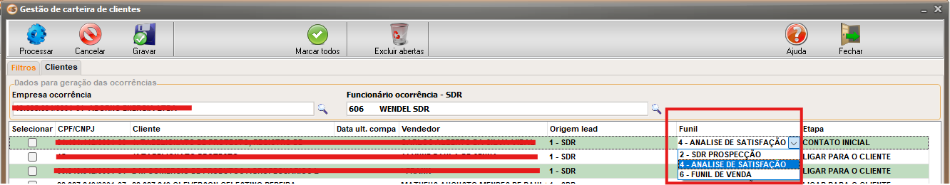 Quando o gestor do CRM realiza a gestão da carteira de clientes, ele pode selecionar qual funil será atribuído ao SDR.