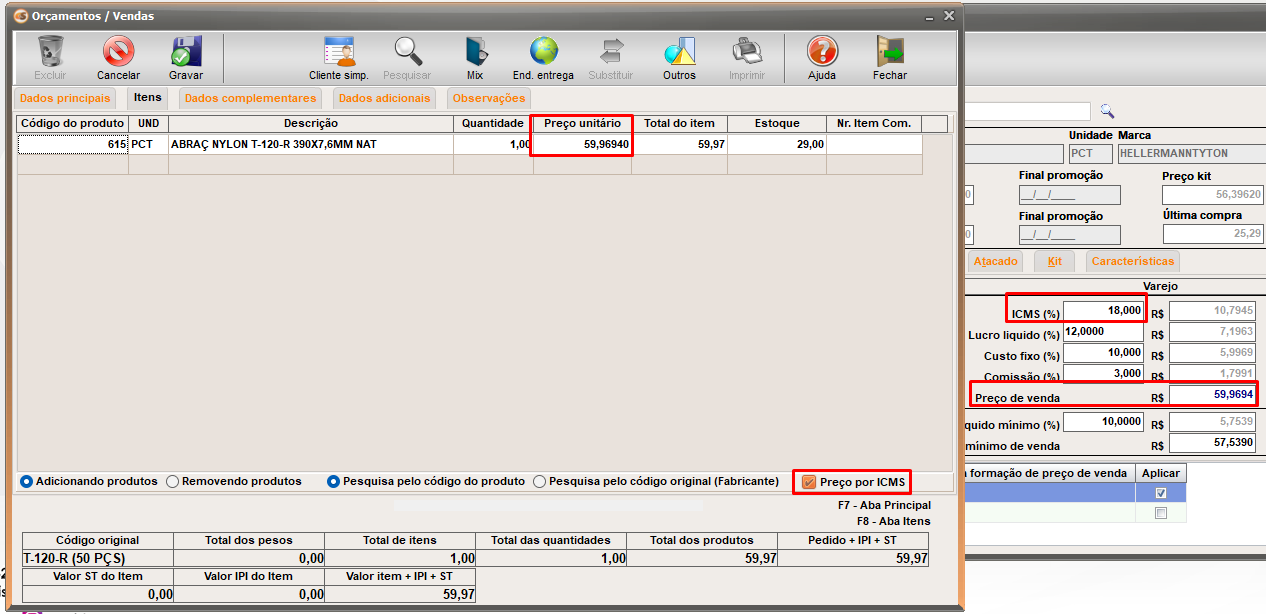 Com os parâmetros ativos e flag "Preço por ICMS" marcada no cliente, o preço do produto será ajustado conforme tributação.