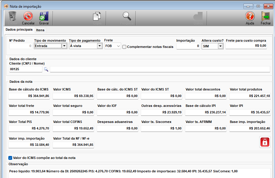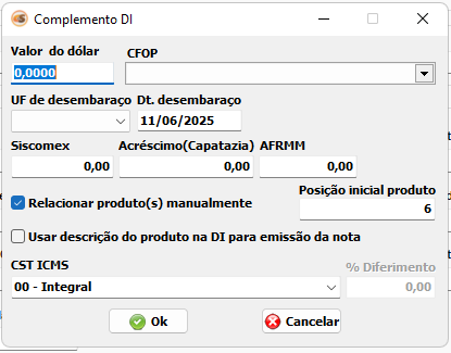 📦 O sistema irá carregar automaticamente os dados da Declaração de Importação para os respectivos campos da nota fiscal de entrada.