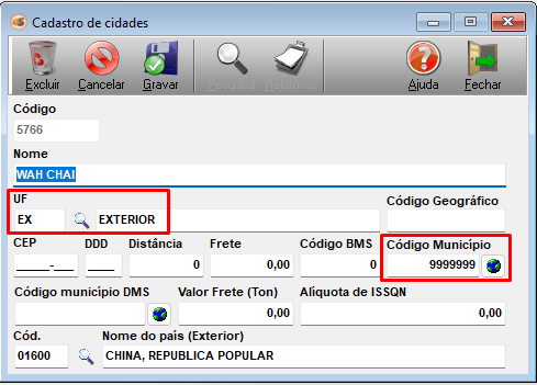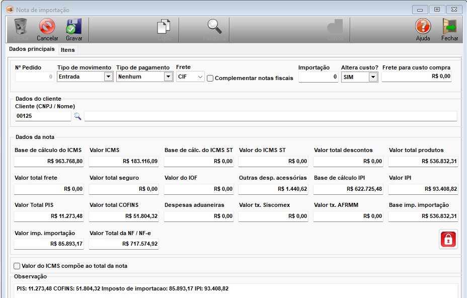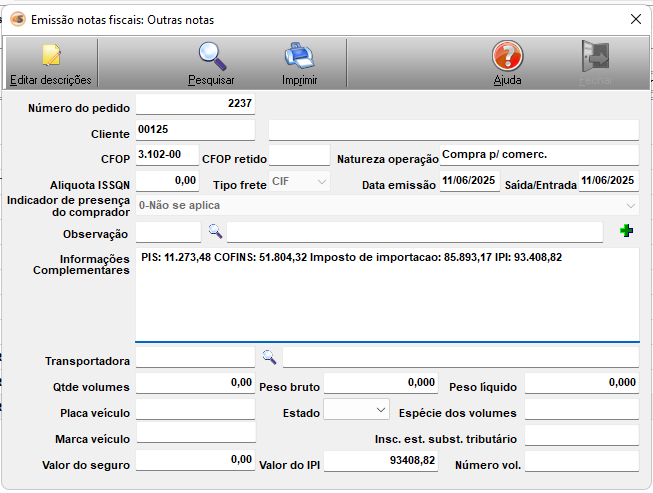 Menu: Vendas > Emissão de Nota Fiscal > Nota de Importação
