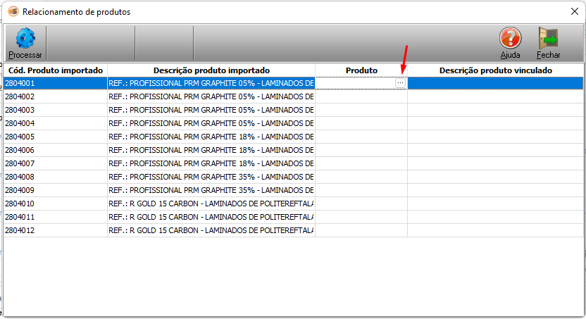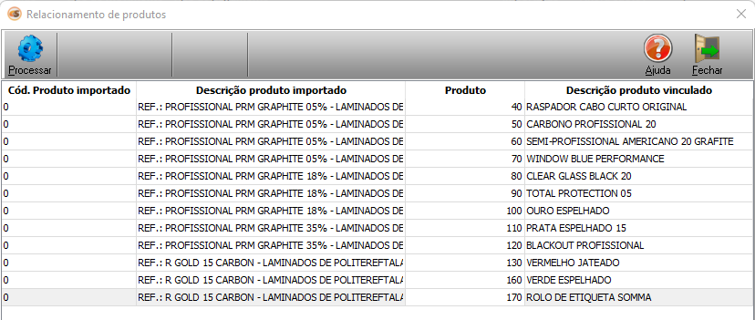 Clicando em 'OK' a tela de relacionamento é apresentada (no caso de dúvida nesse ponte, volte em Vínculos de produtos com cadastro do sistema).