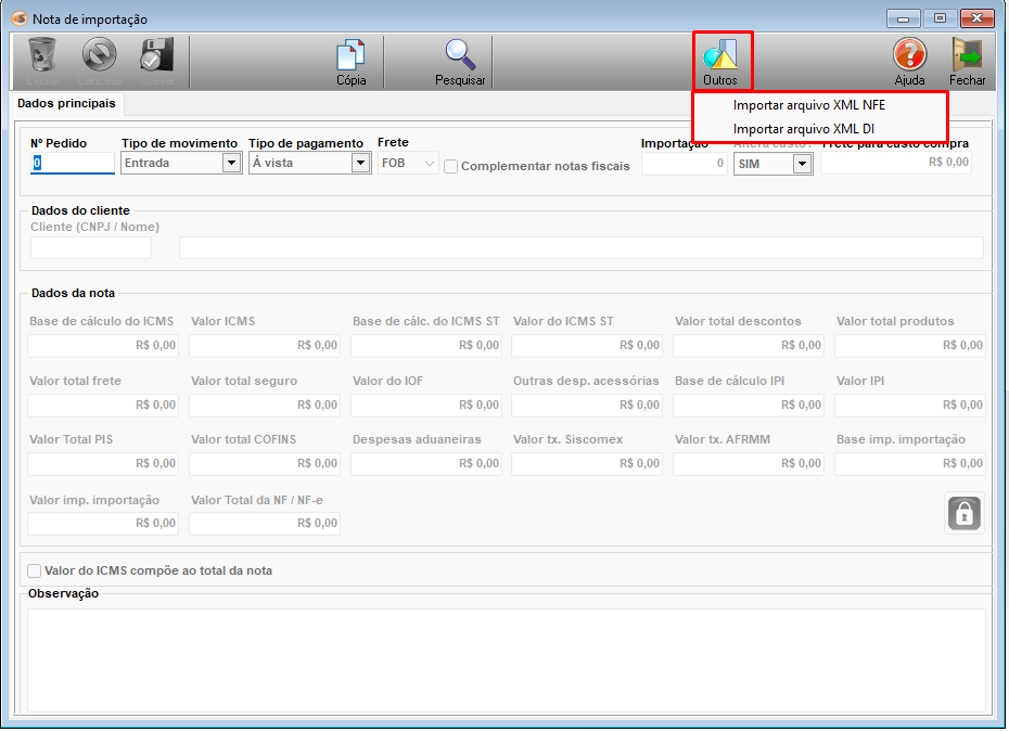 Na tela de Nota de Importação, temos duas opções de importação disponíveis no menu Outros: