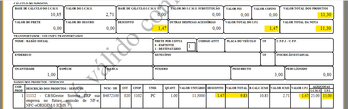 do IPI, porém é reduzido novamente por conta do desconto com o mesmo valor.