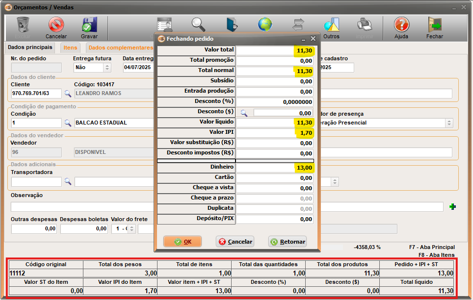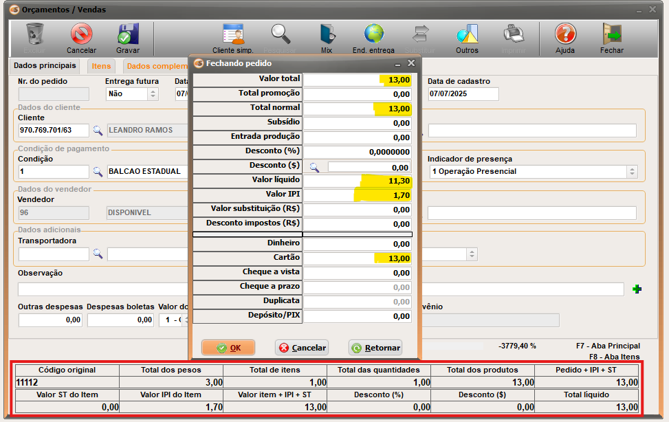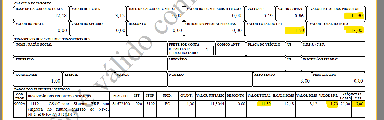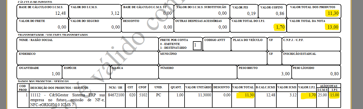 e está embutida, o sistema vai calcular que R$ 1,70 é IPI e R$ 11,30 é o valor