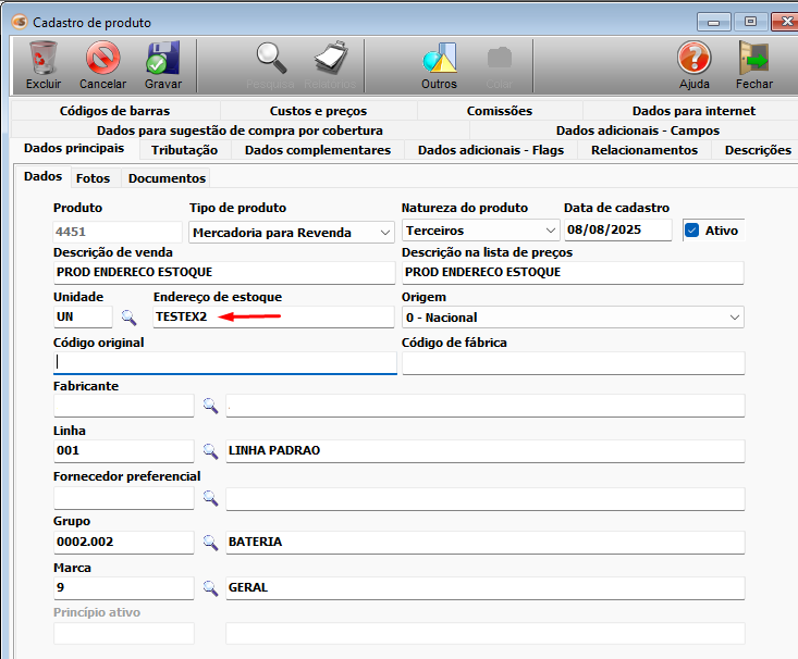 2. Cadastre o endereço de estoque do produto em Cadastros | Produtos | Produtos: