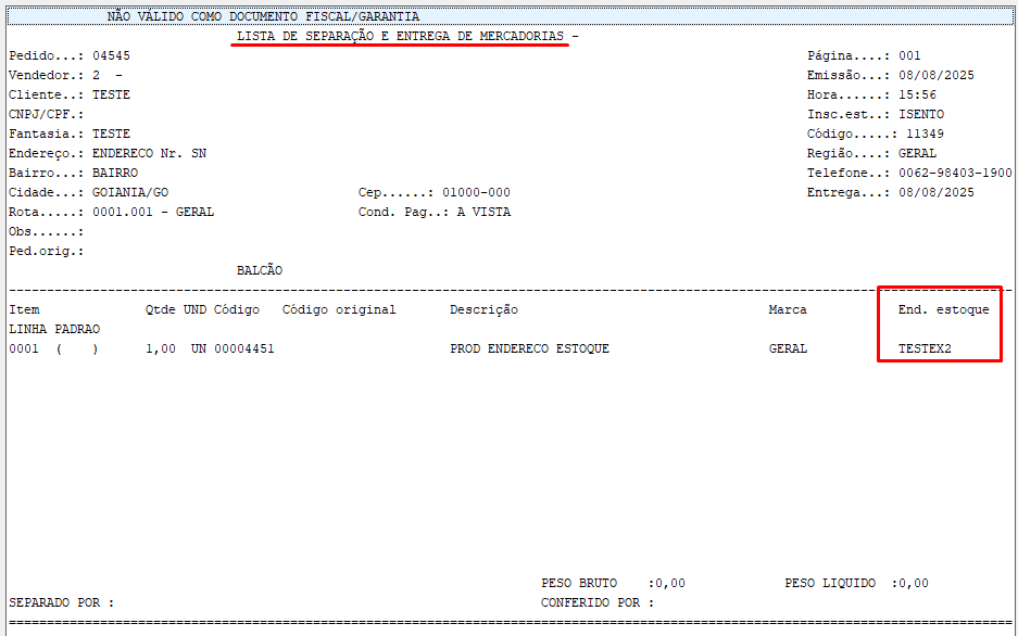 Sendo assim, durante a venda destes produtos, na gravação do pedido, o endereço de estoque é exibido na lista de separação: