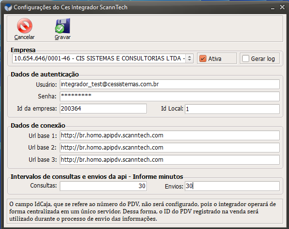 As credenciais de acesso à API Scanntech devem ser fornecidas pela Scanntech.