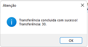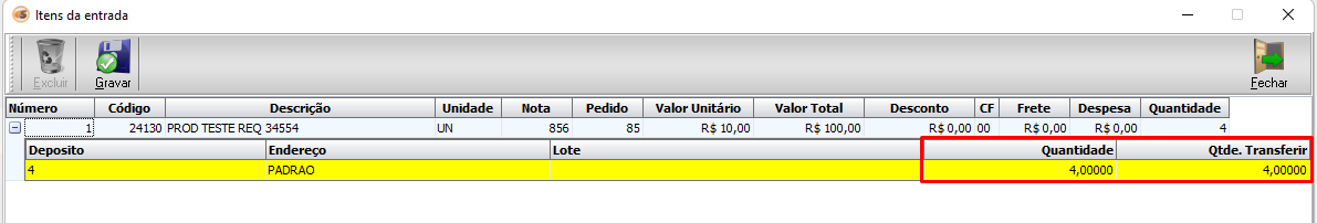 Verifique o campo 'Quantidade' e o campo 'Qtde. Transferir'. Caso deseje a transferência pode ser parcial, deve-se editar a 'Qtde. Transferir'. Depois deve-se clicar em 'Gravar'.