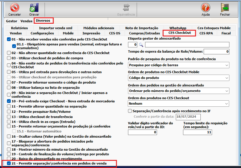 Foi adicionado um novo parâmetro que habilita uma nova funcionalidade no sistema: Diversos | CES CheckOut | 21 - Permitir separação\conferência em pedidos de venda.