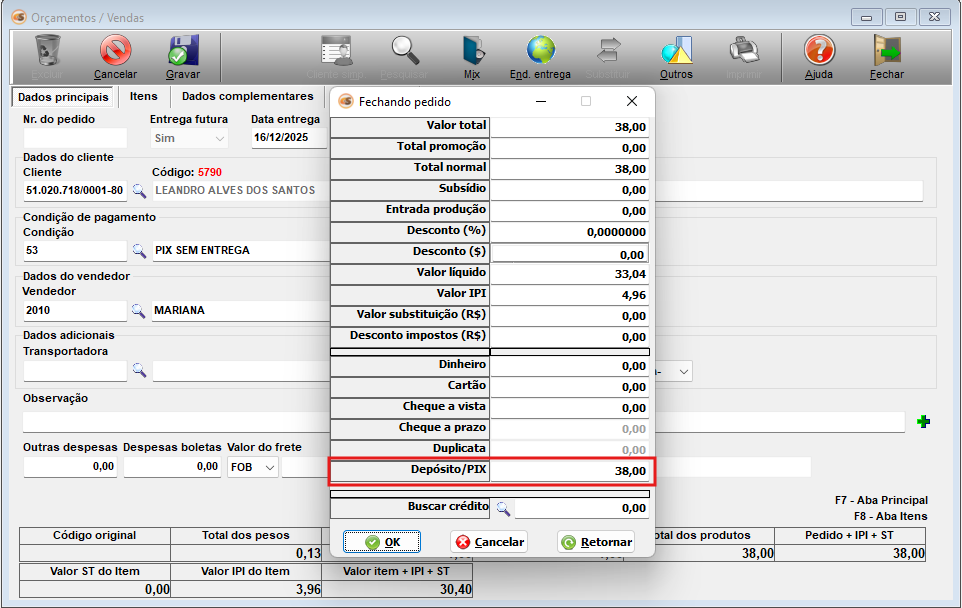 Também foi customizado a geração do PIX mesmo onde a condição de pagamento da venda não seja PIX. Ou seja, se parte do valor for informado para recebimento em Depósito/PIX, o sistema gera o Qrcode e o link para envio. Um exemplo seria uma venda na condição A vista, com parte do valor sendo recebido em dinheiro e o restante em PIX.