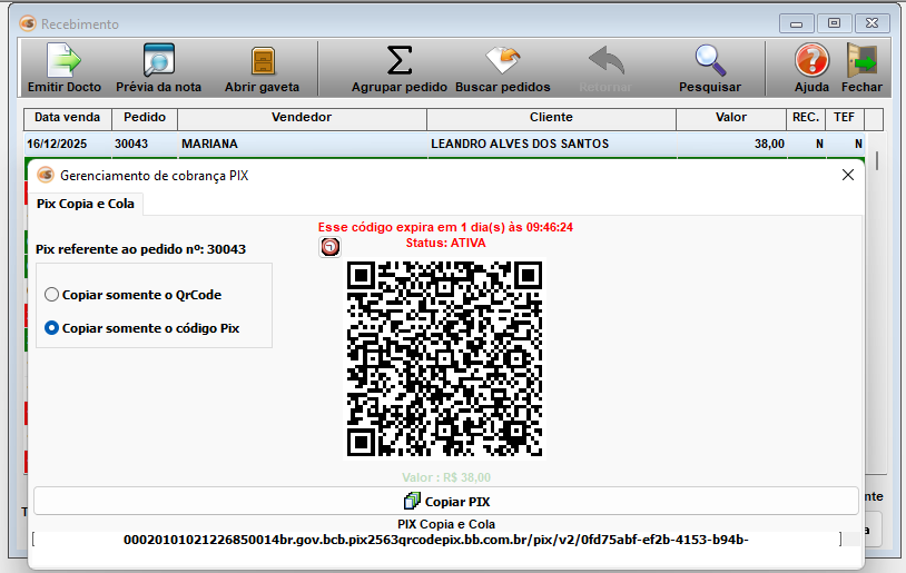 Ao clicar para receber a venda, será aberto a tela do Gerenciamento de cobrança PIX. É gerado o QrCode personalizado com o valor e o código PIX. Ambos podem ser copiados e encaminhados ao cliente da maneira que o usuário preferir.: