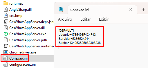 1. O arquivo 'Conexao.ini' deve estar dentro da pasta, nele deve conter os dados da base (figura 2):