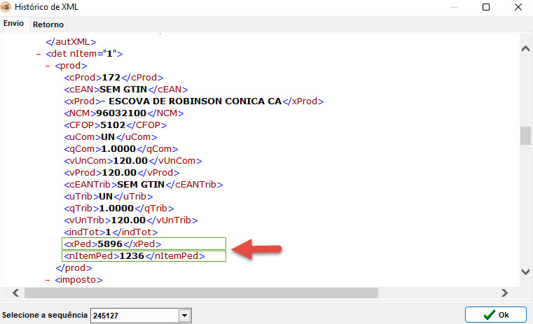 - Clique na aba "Envio" e localize a tag no XML, note que estará os dados preenchidos de acordo com a tela de orçamento: