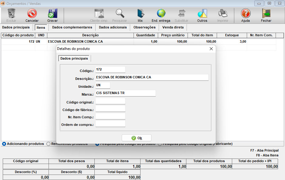 - Clique na aba itens informe o produto desejado, insira uma quantidade e preço;
