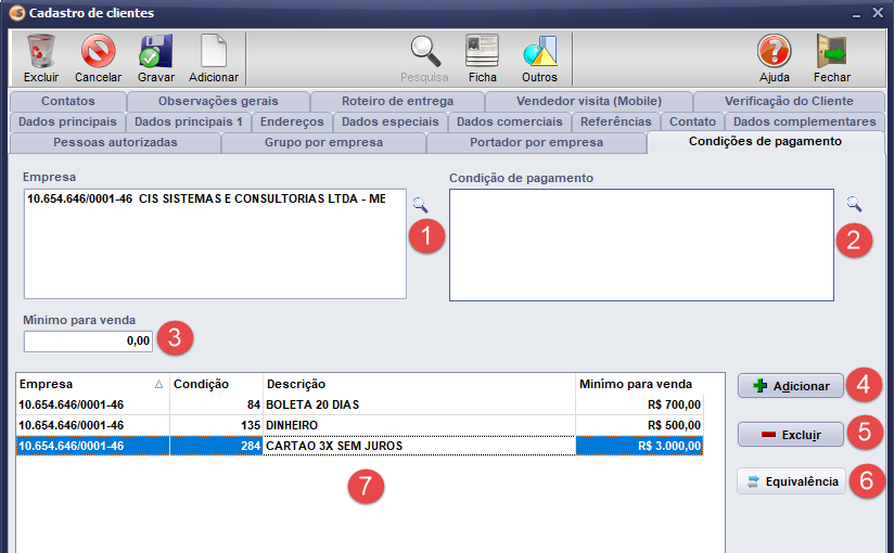 4. Adiciona para o cliente a configuração de condição de pagamento e seu respectivo mínimo para venda.