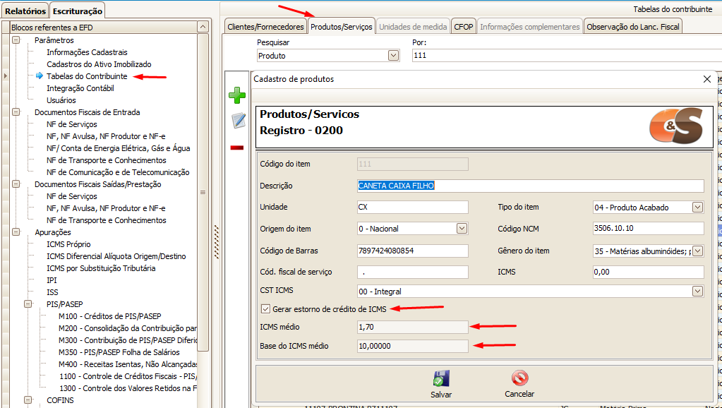 Escrituração | Parâmetros | Tabelas do Contribuinte | Produtos/Serviços.