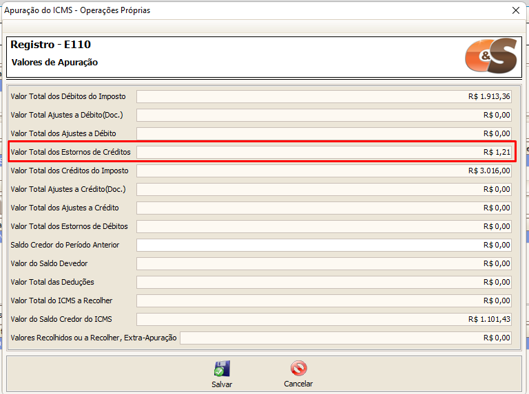 Ao acessar a escrituração em Escrituração | Apurações | ICMS Próprio, na seção referente ao Registro E110, serão exibidos vários campos, verifique o 'Valor Total dos Estornos de Créditos'. (Tela 06)
