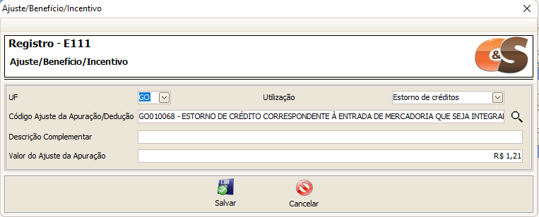 No Livros vamos configurar o código de apuração referente ao registro E111: em Escrituração | Parâmetros | Informações cadastrais | Códigos de apurações, caso não tenha registro, cadastre. Com um duplo clique em cima do registro, selecione o 'Código do benefício fiscal para estorno de crédito de ICMS - E111. (Tela 04)