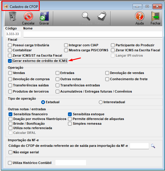 2- No cadastro de CFOP foi adicionado o campo “Gerar estorno de crédito de ICMS”. (Tela 02)