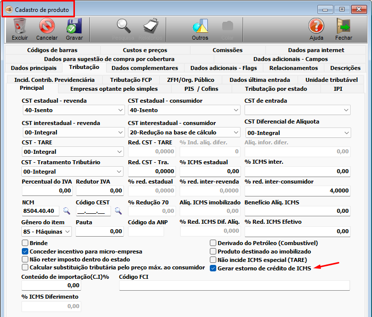 Localize um produto que esteja com a flag mencionada anteriormente (conforme Tela 03) marcada e verifique se a opção "Gerar estorno de crédito de ICMS" está habilitada.