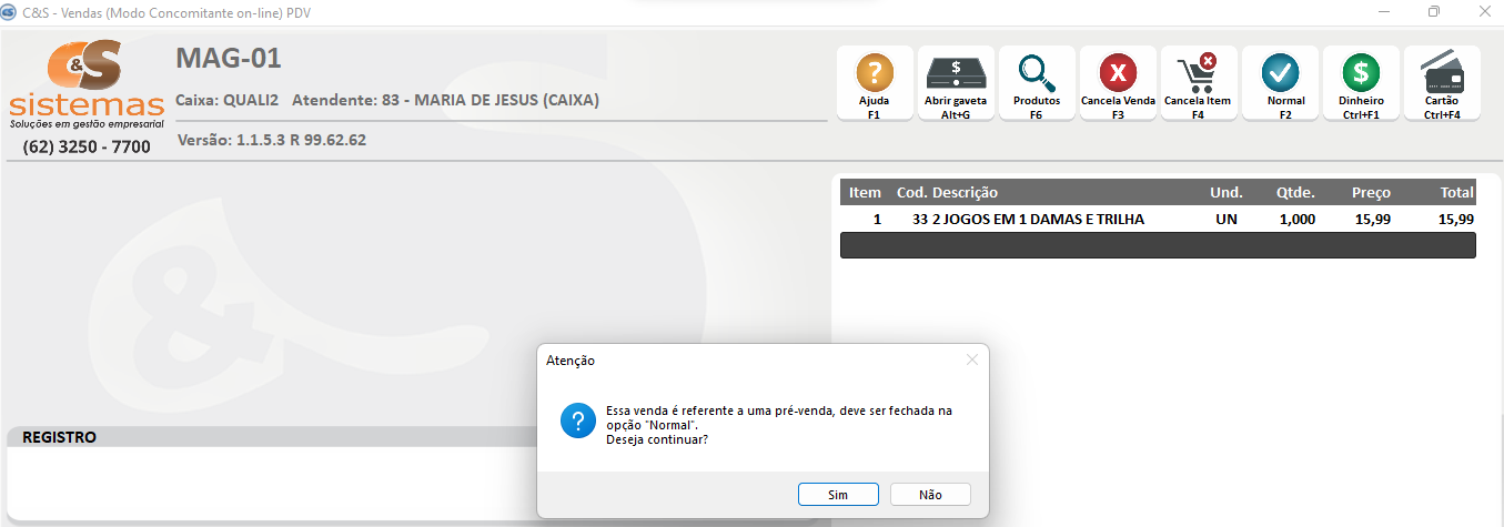 Quando o usuário com cargo Caixa busca a pré-venda (Ctrl + B), caso a venda possua desconto no fechamento, na tentativa de clicar direto nos botões Dinheiro ou Cartão, o sistema avisa que deverá fechar na opção Normal e será questionado se deseja continuar, se sim será redirecionado para a tela de fechamento normal com o desconto carregado.