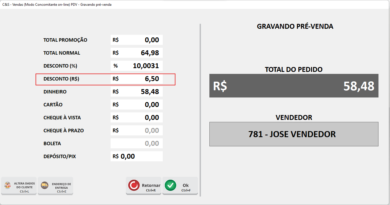 Posteriormente, ao buscar a pré-venda (Ctrl+B) o valor da venda apresentado na tela é o total bruto (sem o desconto) pois o desconto é de fechamento.